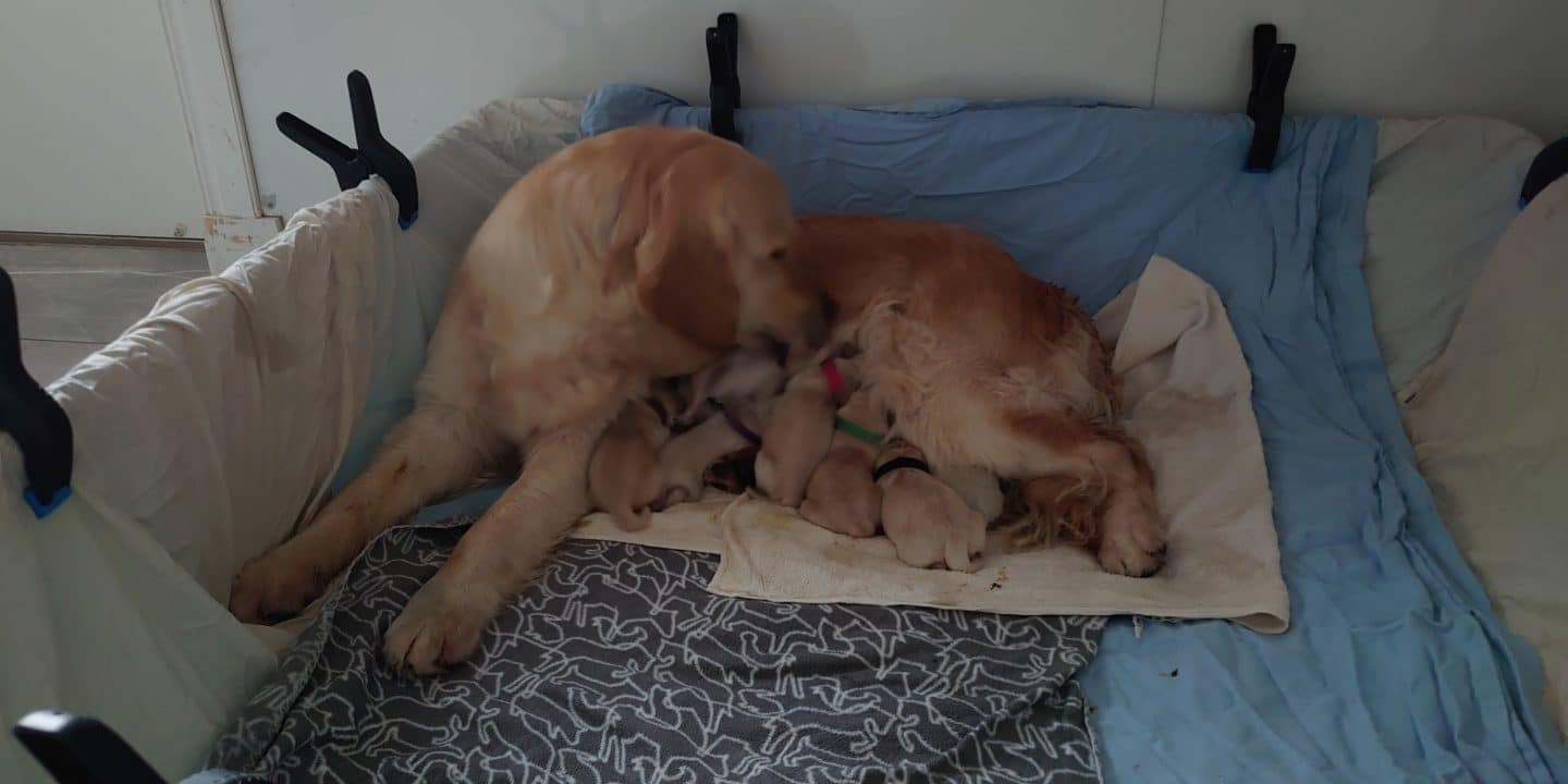 På påskdagen den 31 mars fick Lady sina valpar. Det blev sju stycken. Alla är pigga och friska och mår bra. Valparna är starka och visar redan humör. Det blev tre hanar och fyra tikar som var ungefär jämnstora. I stora drag verkar det vara en jämn kull med fina små goldenhundar. Lady har skött alltihop alldeles utmärkt och är en fantastisk mamma som pysslar om sina små på bästa sätt.