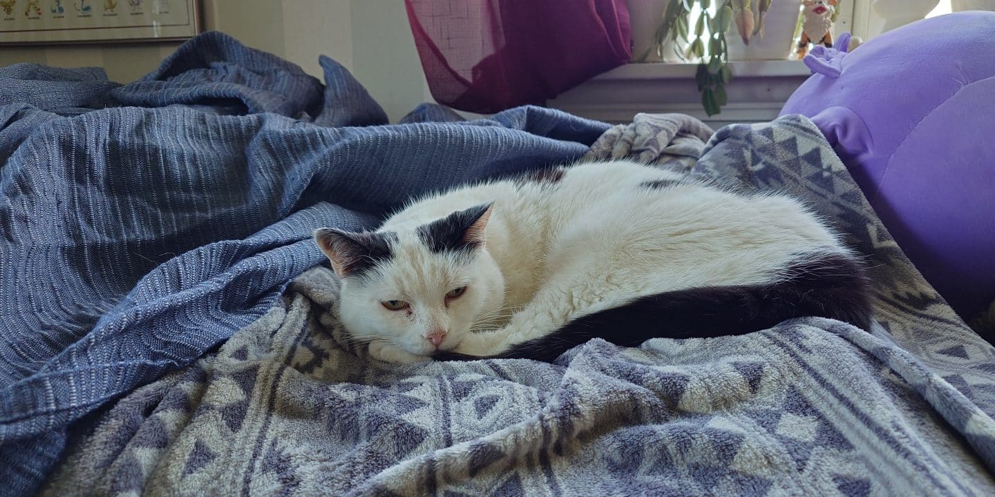 Han är en mycket snäll och go katt som är van vid mycket kel och långa vilopauser i sängen. Nu till en början bor han i en sig i huset men snart nog ska han få träffa gårdens andra katter och få vara både ute- och innekatt igen.