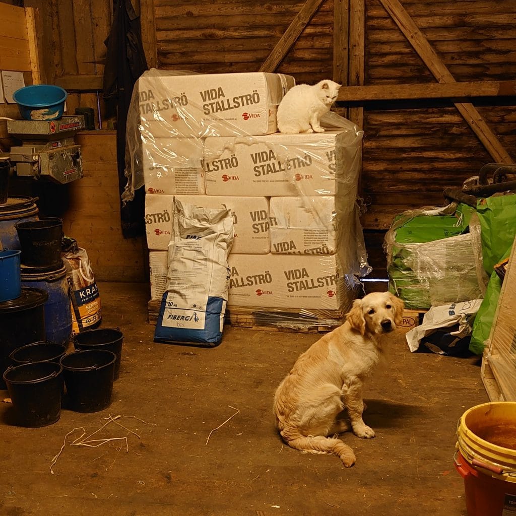 Utefter vad grovfodrets analys visar köper vi in kompletterande kraft- och mineralfoder för att optimera hästarnas och fårens foderstater. Inför höst och vinter köper vi även hem korn och vete vilket vi använder som fågelfoder.