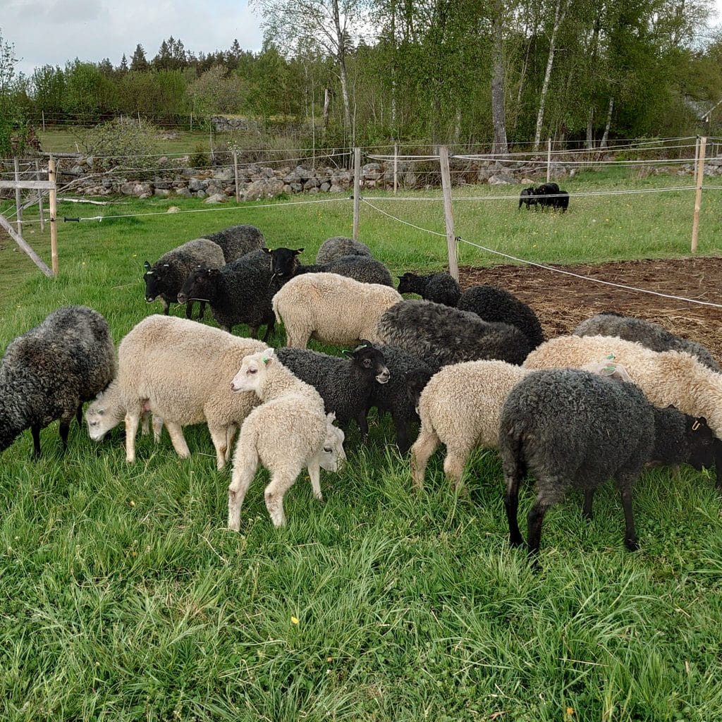 Alla får och lamm går ut på bete i maj/juni och tackorna tas in fram på hösten. Lammen skiljs av i slutet av sommaren och går sedan på bete tills vi själva kör dem till ett lokalt slakteri.